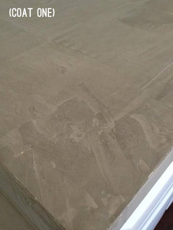 Each block is just pounds. To make the vanity top, pour the concrete to the actual size of the piece of furniture being use making sure to leave holes for the plumbing to go through. Essentially, you pour some Ardex Feather Finish (it’s a powder) into your bucket and add some water, then stir. You’re going for the texture of a thin pancake batter. It may be that here is a time when the owner builder has to get help, because laying slabs is an arduous, time consuming process best suited to sub-contractors.